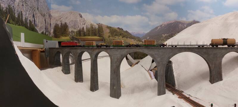 De achtergrond is een 'stitch' van 3 thema's uit Graubünden: Links de rotspartijen van de bergen boven Preda. In het midden gevolgd door het dalzicht van bovenaf richting Bergün en het meest rechtse stuk is een aangezicht van een aantal huizen net buiten Filisur met daarachter de wat lieflijker aandoende bergen daar. Hij past mooi en ik kan het landschap er nu 'tegenaan' bouwen.