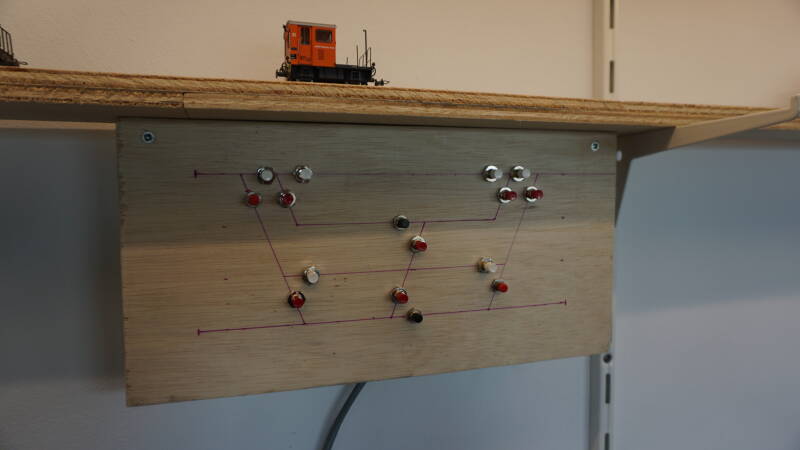 Naast de automatische bediening van wissels door koploper heb ik ook de mogelijkheid om via 2 zelfgebouwde bedientableaus zowel het Klooiterrein als de industriesporen op Berasur met de hand te bedienen. De werking is vrij simpel. Met behulp van drukknoppen, die een kortsluiting maken met massa, detecteert een S88 decoder (of BMD16N) dat de schakelaar is ingedrukt. Die informatie gaat naar koploper en die zorgt dan dat het wissel wordt omgezet en ook met die stand wordt getoond in het signaleringsbeeld van de hele baan. Hierboven 2 foto's van het bedientableautje van het Klooiterrein.