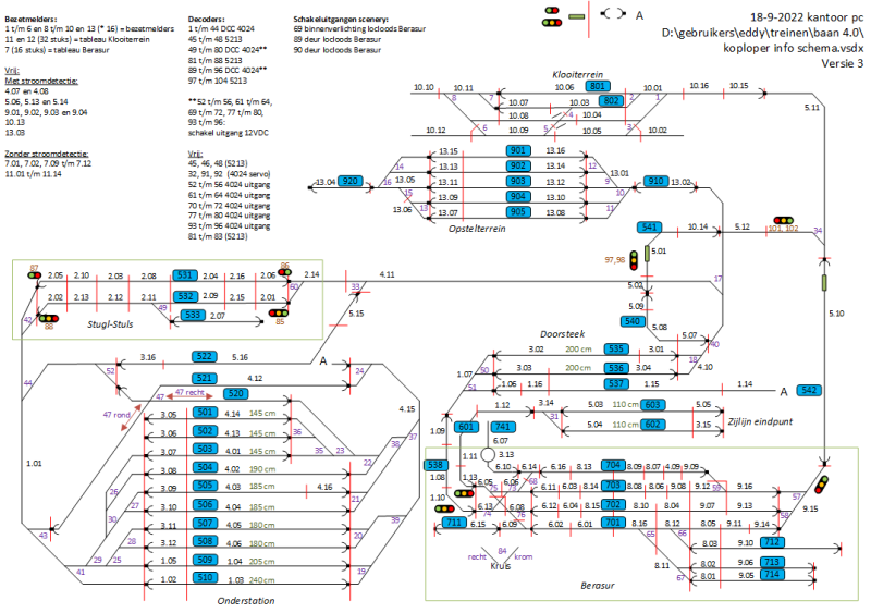 Alle gegevens over de baan die in koploper zijn geadministreerd in de database houd ik ook bij in een Visio tekening. In zwart alle bezetmelders 1.01 t/m 13.16. In paars alle wisselnummers 1 t/m 104 op dit moment 18 sept 2022. In rood de seindecoder nummers. In blauw omrande rechthoeken alle bloknummers (501 t/m 920). In die bloknummers zit een systeem: