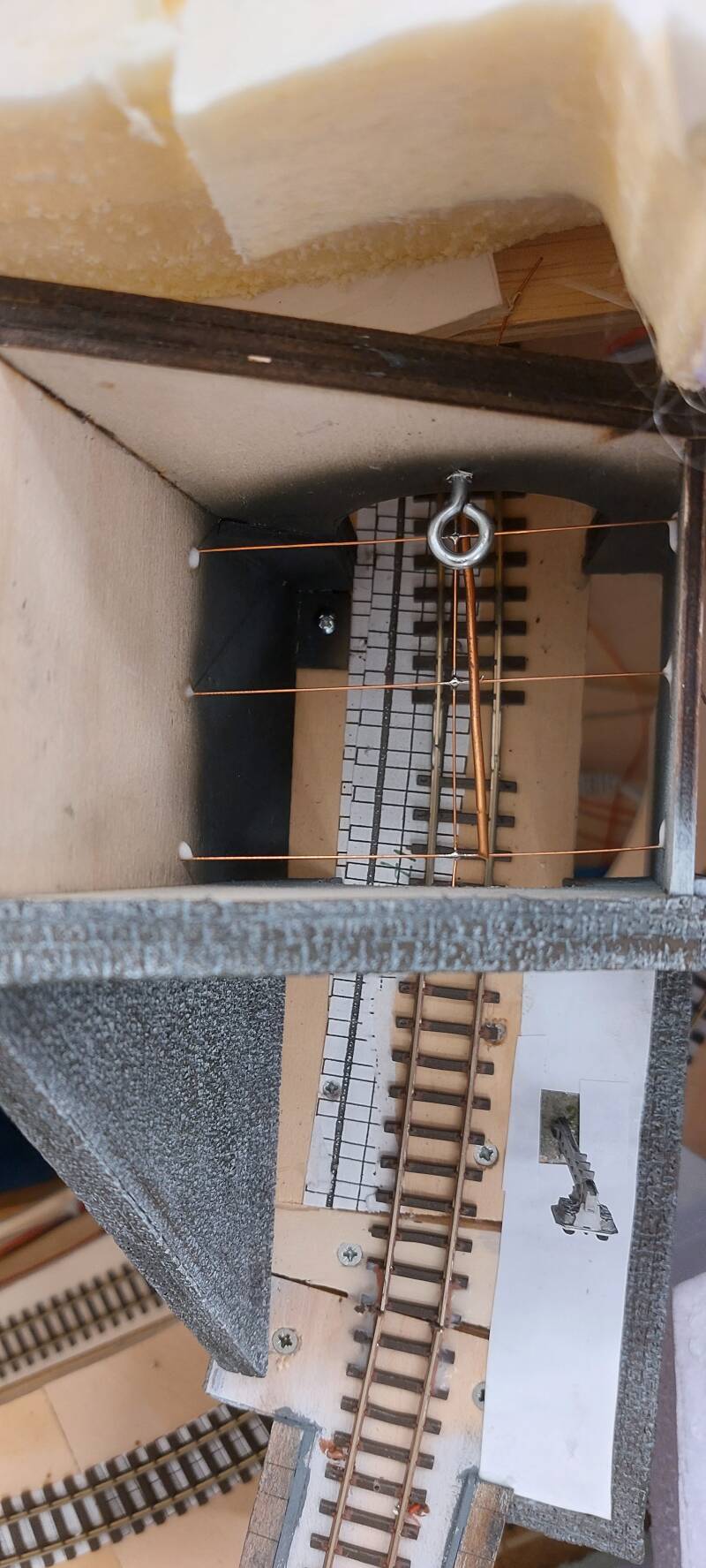 Hieronder het eindresultaat van het netje in een tunnelingang. In de ingangsboog van de tunnel en lawinegalerij heb ik de beugel gemaakt met een stukje bovenleidingdraad en een paar isolatoren. Een mal die ik van hout heb gemaakt geeft me de exacte hoogte van de bovenleiding ten opzichte van bovenkant railstaaf van 52 mm.