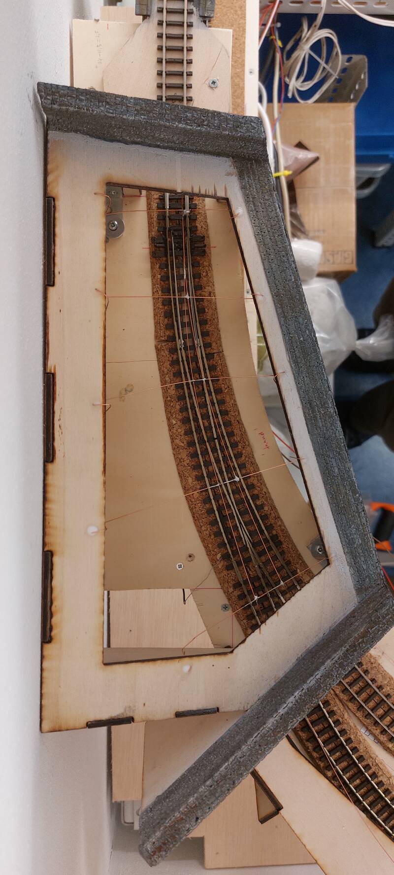 Alle tunnelingangen hebben nu een 'vanger' in de tunnel en een overgave naar de 52 mm bovenleiding 'in het zicht'. De bovenleiding 'in het zicht' gaat gemaakt worden na ballasten en basis afwerking van het landschap.