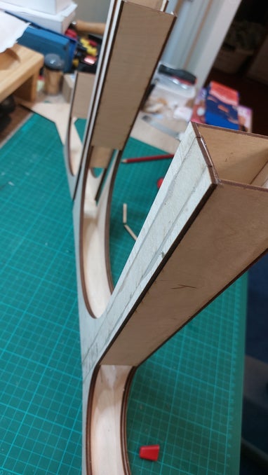 De ronde binnendelen van de bogen heb ik laten snijden uit 1 mm styreen. Dat materiaal laat zich makkelijk buigen en past dan strak in de daarvoor gedachte sponning. Ook die binnendelen worden met houtlijm vastgezet.