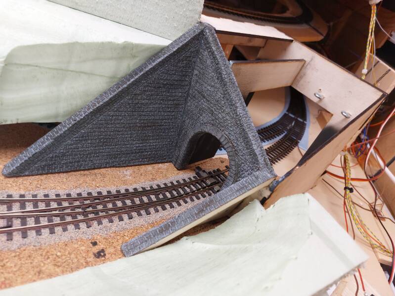 De tunnelingangen op deze baan hebben allen een dubbelrol. Enerzijds de zichtbare afscheiding van de baan in het landschap richting de technische onderwereld, anderzijds ook als bovenleiding afspanpunt. Dat laatste is de grootste reden om te besluiten om de tunnelingangen zelf te maken. Het zijn best 'zwaar' ontworpen dingen geworden die de kracht van de afgespannen bovenleiding straks goed aankunnen. Alle tunnelingangen hebben daarom schroefogen aan de achterkant waar straks veren in kunnen haken en ook kunnen ze allemaal aan het frame van de baan worden vastgeschroefd. Daarnaast moet het zichtbare deel er natuurlijk mooi uit komen te zien.