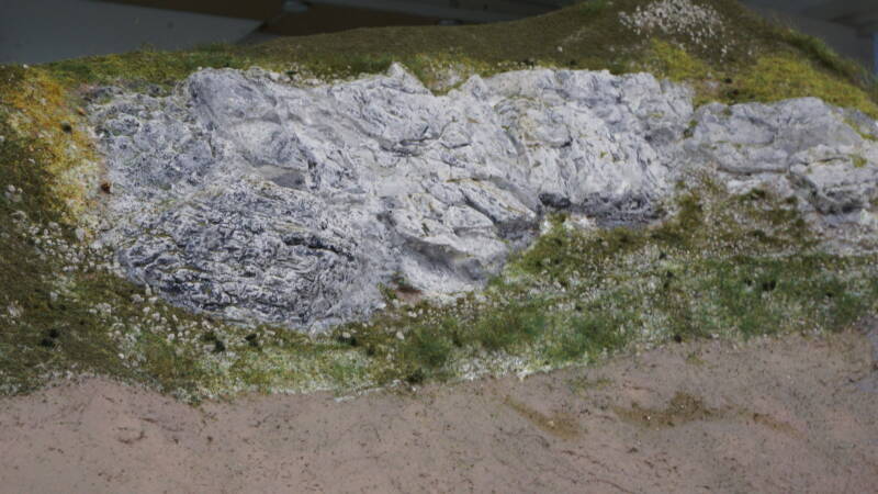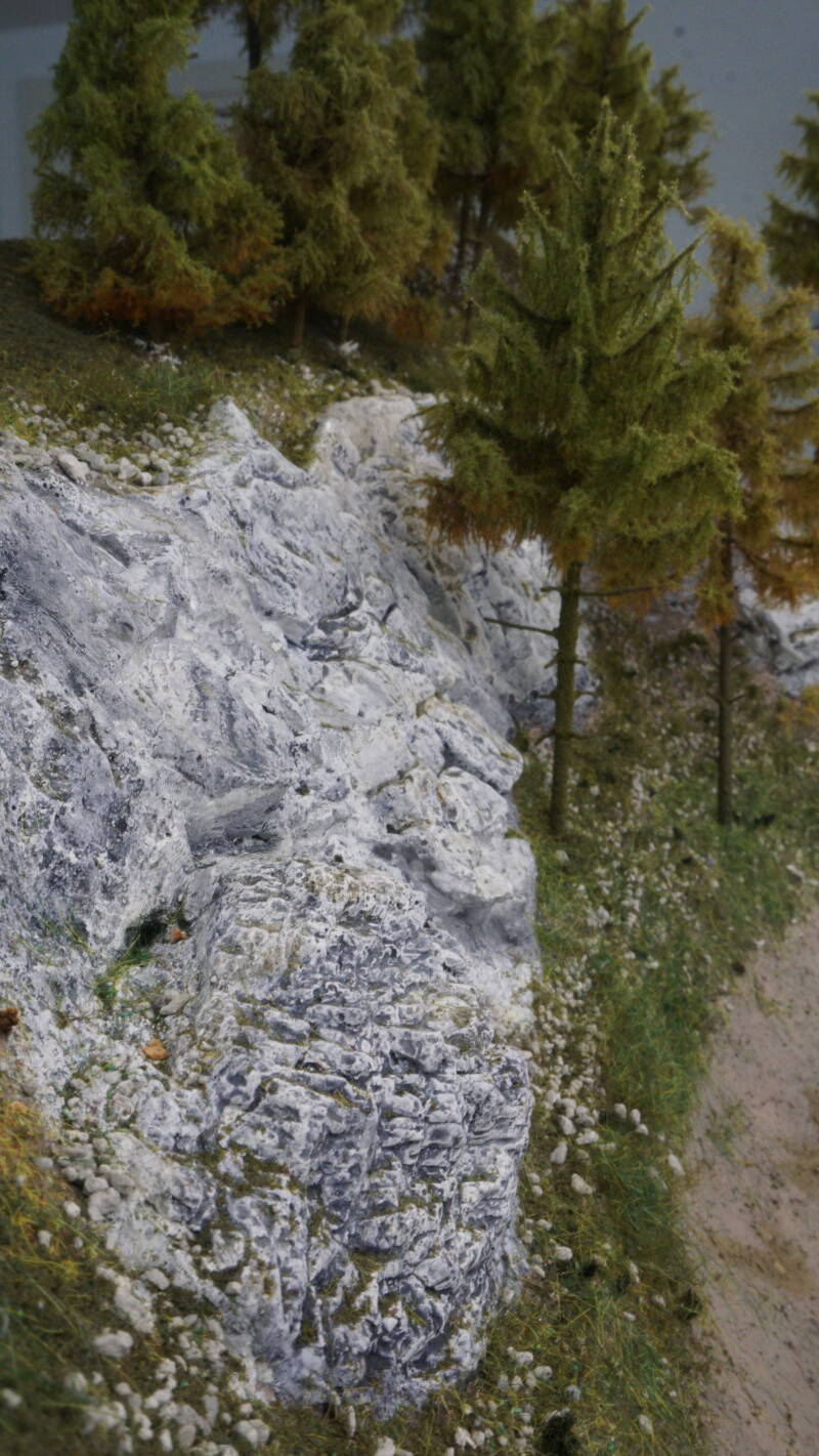 Boven Berasur is ook een rotsformatie zichtbaar die is gemaakt met geleende gietmallen en modelgips, geschilderd met verdunde witte latex om het gips te dichten en daarna met verschillende washes op basis van Amsterdam acryl verven (zwart, omber, gebrand omber en een beetje wit) te boel prachtig op te doen komen in al zijn reliëf. Heel tevreden mee! Het rotsige deel wordt omkleed met bos en bestaat vooral uit Woodland turf, hier en daar een plukje gras en veel stenen van Woodland. De eerste lariksen staat ook reeds: