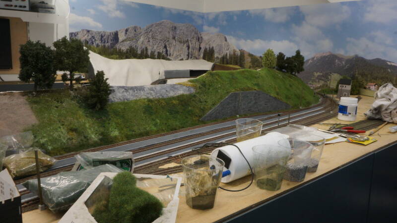 Het landschap van de baan begint met een basis vulling. Deze staat beschreven in Landschap basis. Het gipsen 'frame' kan daarna worden afgewerkt. April 2024 is daar een begin mee gemaakt met als eerste project de heuvel achter Berasur. De gebruikte materialen om deze groene heuvel zo te krijgen zijn: