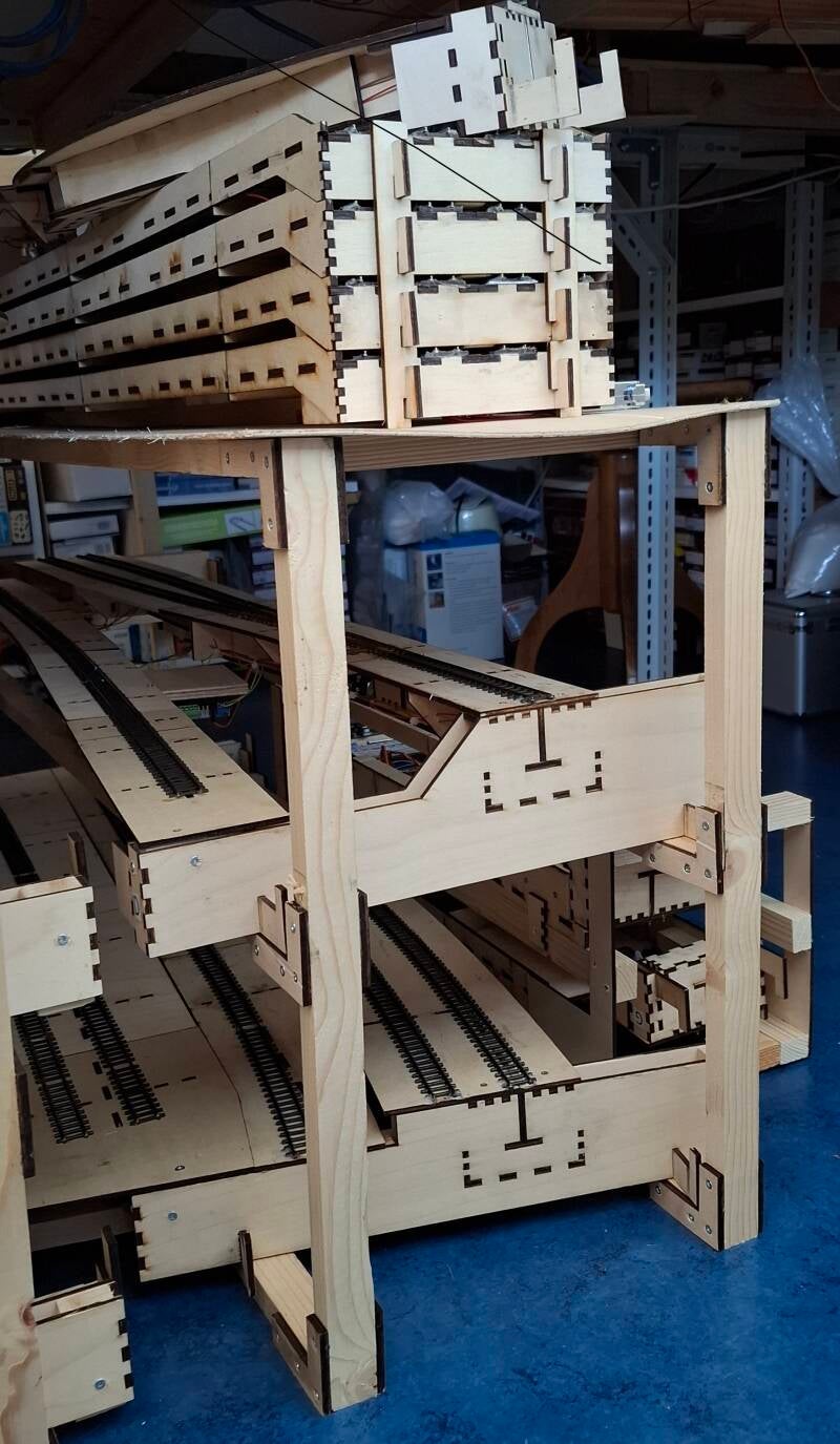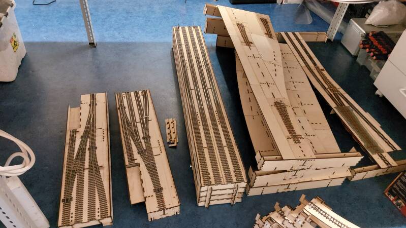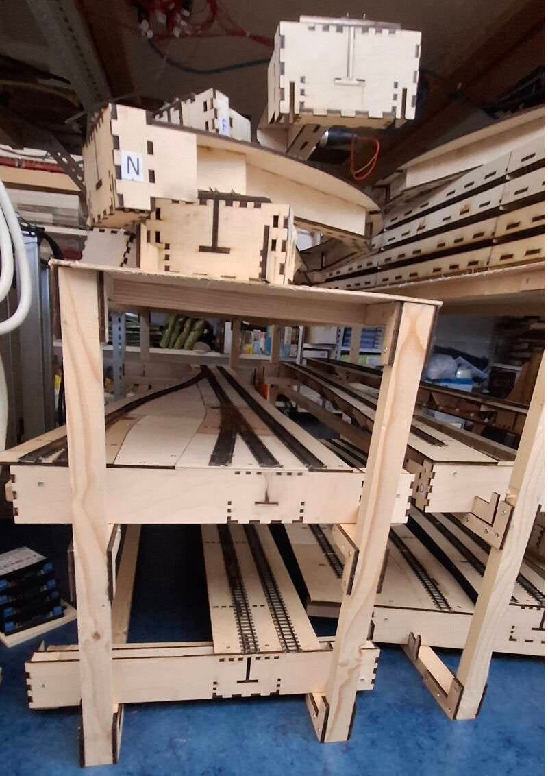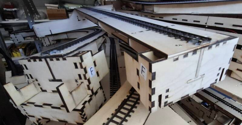 Nog een leuk ding: al het houtwerk van de modules is uitgelaserd uit 4 mm multiplex A3 plankjes. Mijn laser heeft overuren gemaakt...