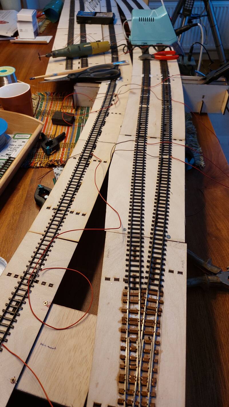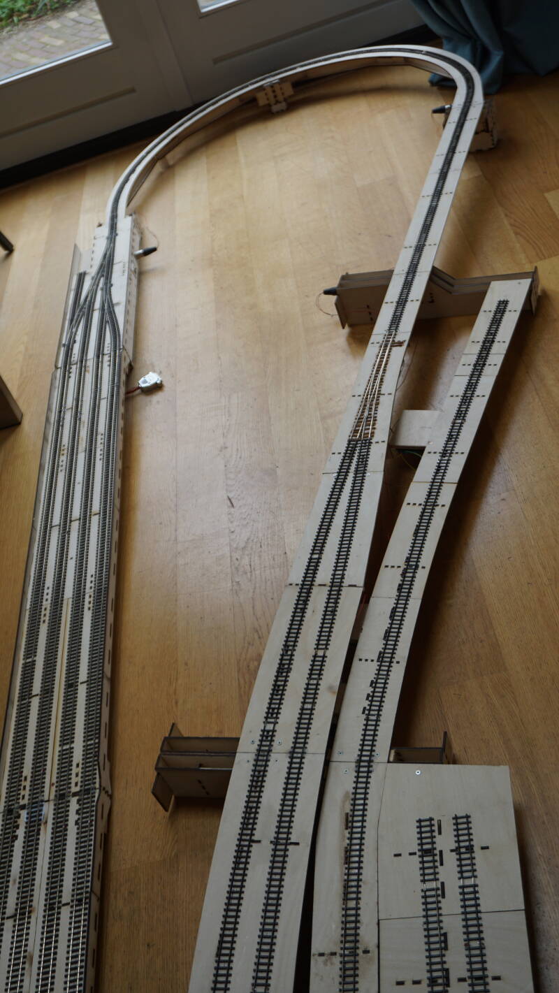 Hierboven een foto van de modules in opbouw. Links de 2 wisselstraatmodules W1 en W2, dan een pakket met de 4 schaduwstationmodules S1 t/m S4 en daarnaast de 4 stationsmodules 1 t/m 4, nog in railopbouw. Wat niet goed zichtbaar is, is de haakconstructie die ik gebruik om de modules aan elkaar te verbinden, zonder moeilijk te hoeven doen met slotbouten en altijd maar weer stellen van de verbinding.