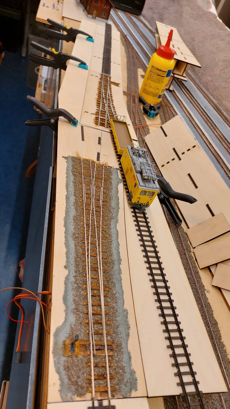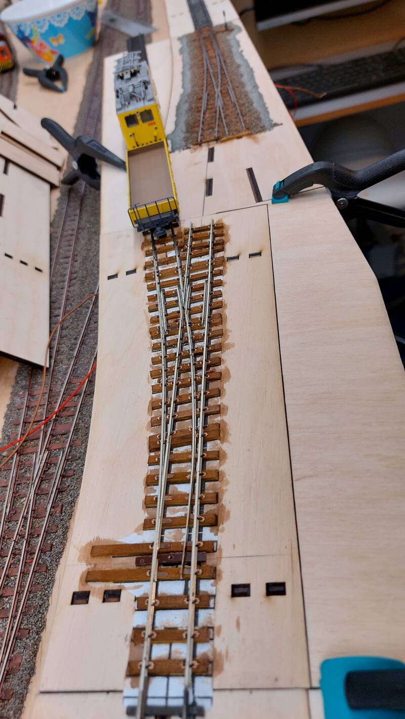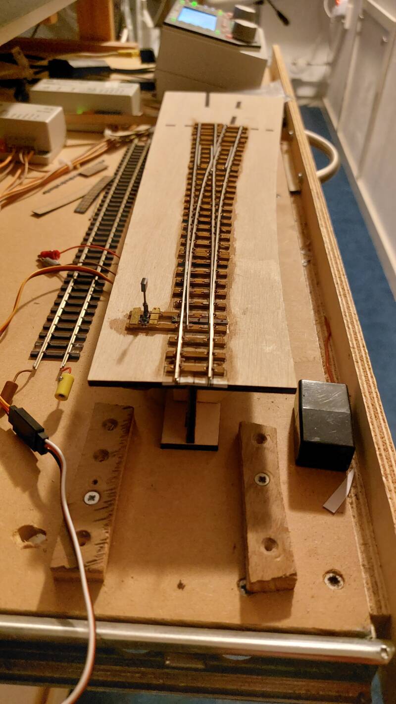 Op basis van deze eersteling heb ik in het ontwerp nog een paar verbeteringen doorgevoerd en nu is het basisconcept wel klaar. Om te testen of het werkt heb ik wat wissels gebouwd die ik nog had liggen en verbonden met wat rechte rails. Daar komen nog wel weer een paar verbeteropties uit, vooral om de modules onderling wat makkelijker te verbinden. Daar moet ik nog ns over nadenken hoe dat beter kan.